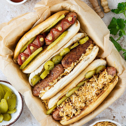 Vatten, ärtprotein, solrosolja, ätbart hölje (förtjockningsmedel: natriumalginat), kikärtsmjöl, stabilisator: metylcellulosa, ärtfiber, destillerad vinäger, kryddor, kokosolja, potatisstärkelse, äppeljuicekoncentrat, naturliga smakämnen, rödbetsjuicekoncentrat, kryddextrakt, vetefibrer, karragenan (E 407), johannesbrödmjöl (E 410), konjakgummi (E 425), mono- och diacetylvinsyraestrar av mono- och diglycerider av fettsyror (E 472e), xantangummi (E) 415), salt.